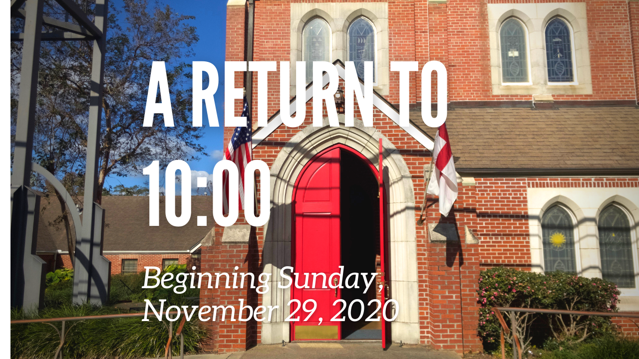 Starting Sunday, Nov. 29, 2020, our in-person celebration of Holy Eucharist will begin at 10:00am. Please note this change.